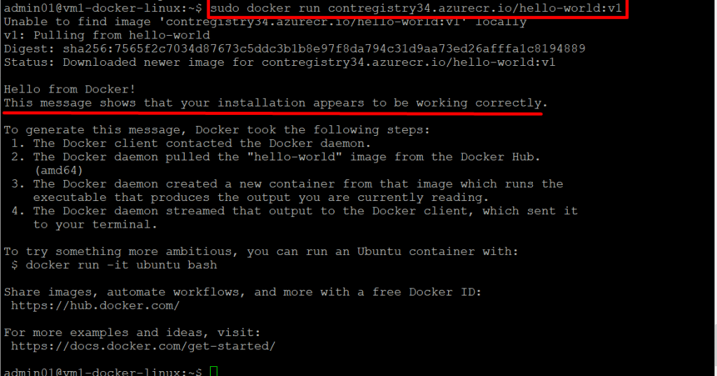 To push an image to Azure Container Registry, you first need a Docker image. If you don’t have a local image, you can pull a public image from Docker Hub to get started.