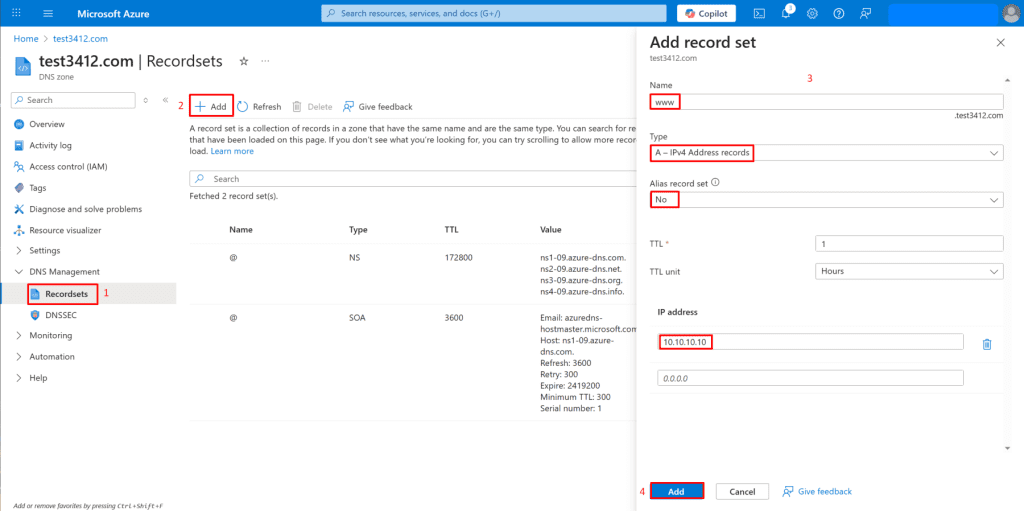 - Add Record Set: Click the "+ Add" button.