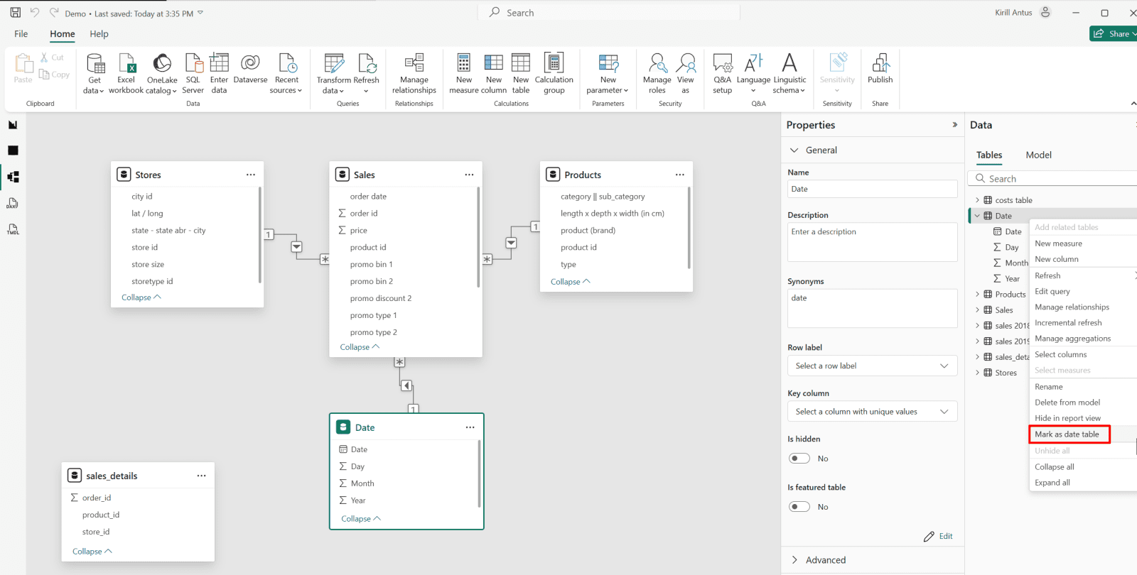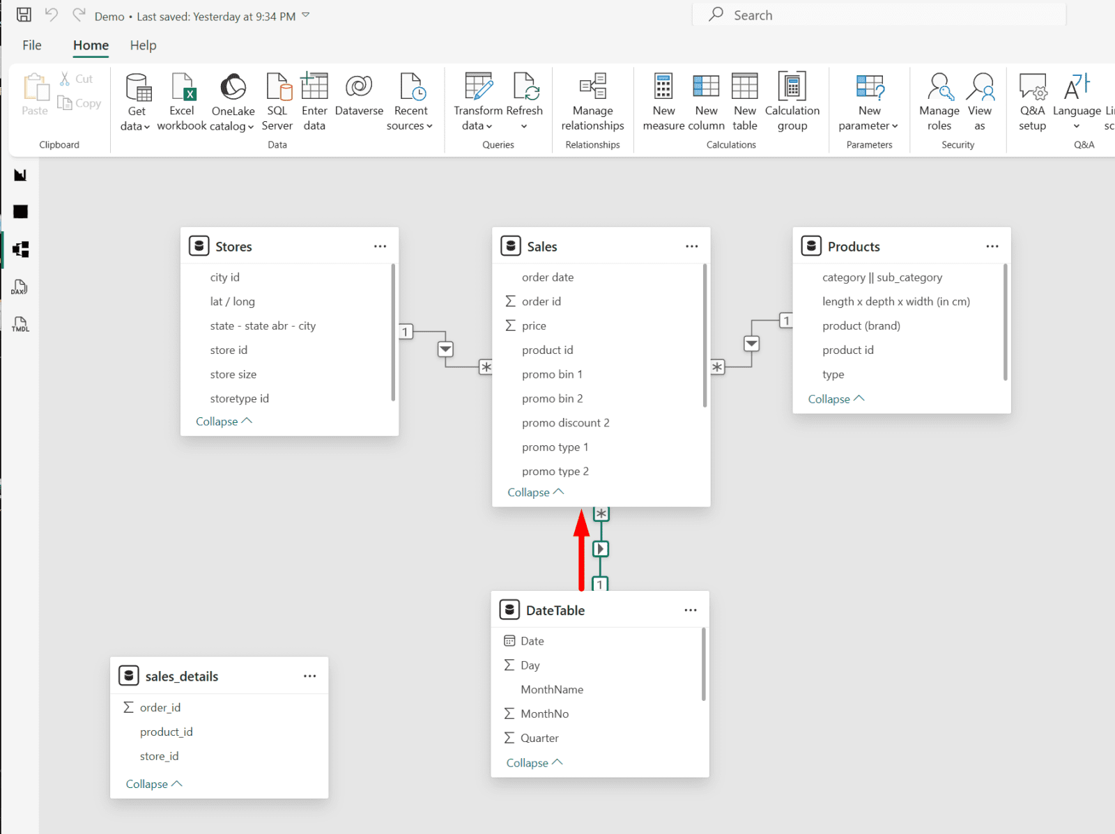 3. Create a Date table using Power Query and establish a relationship between the Date table and the Sales table.