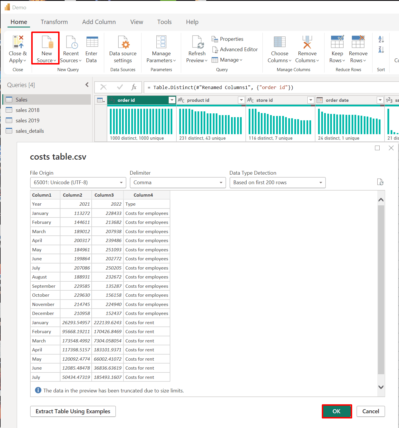 Shape and transform tables by removing rows and columns and promoting the first row to a header.