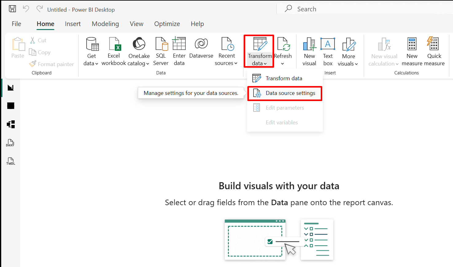 Go to "Transform data" and choose "Data source settings."