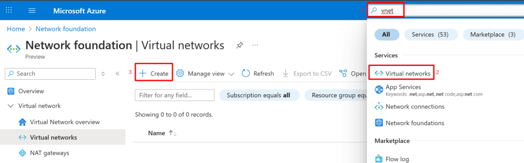 - Search for "vnet": In the Azure portal search bar, type "vnet" and select "Virtual networks" under Services.