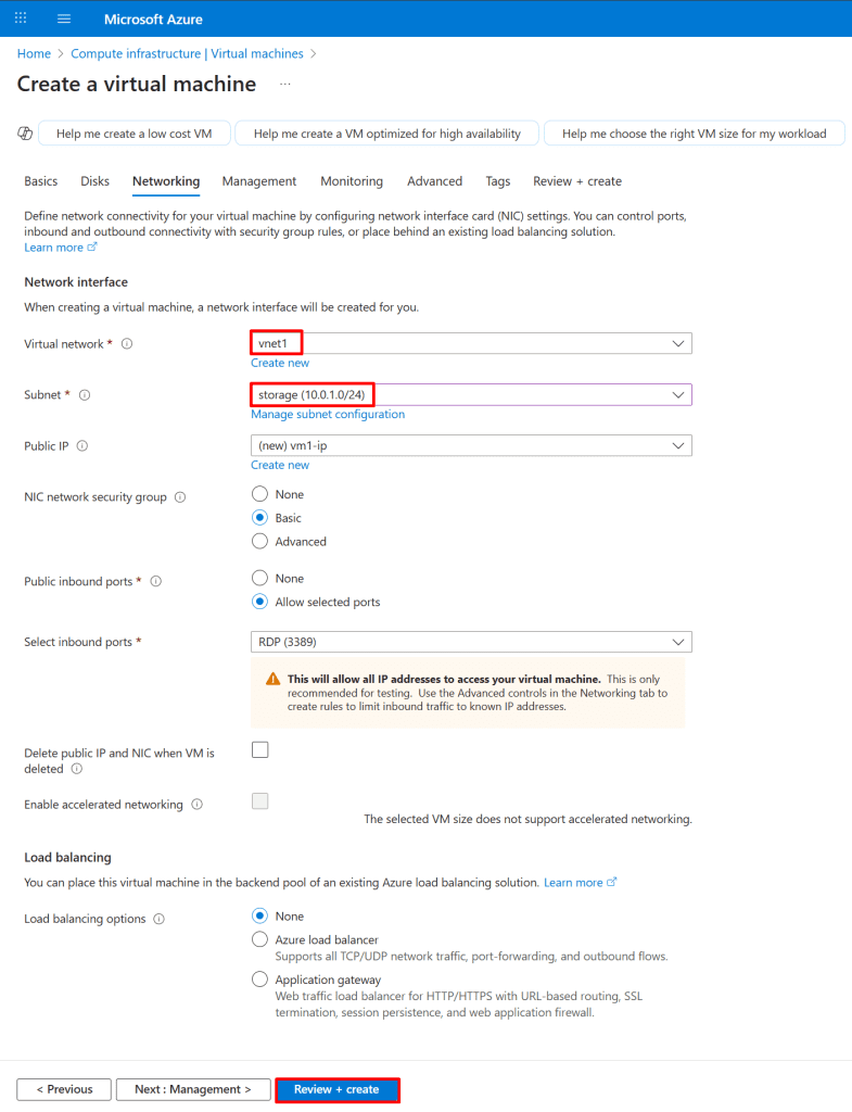 6. In the Networking tab, configure the private endpoint to allow access only from the storage subnet, then click Review + create.