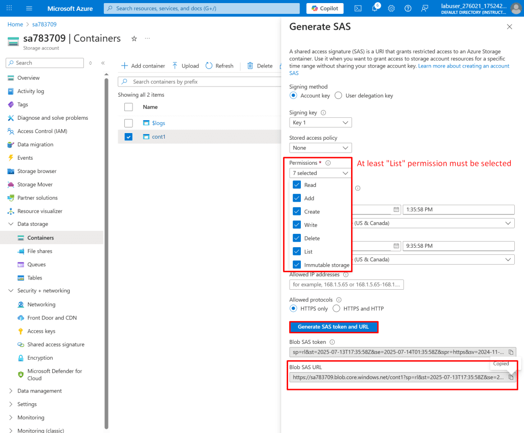 - Navigate to Containers: In the storage account sa783709 blade, click on "Containers" under "Data storage" in the left-hand menu.