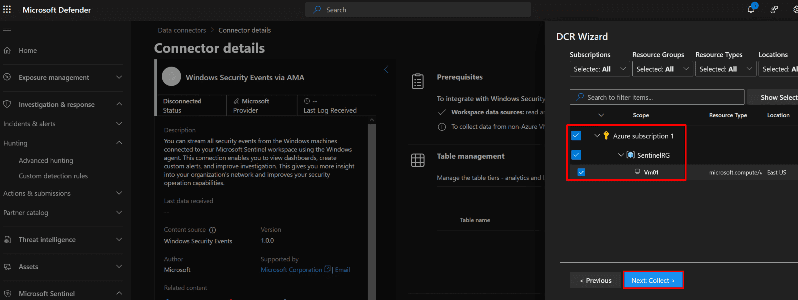 Note: This step creates a Data Collection Rule (DCR) that defines how security events are collected from your virtual machines.