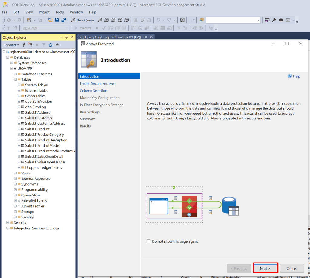 3. Log in to the Database database as Admin01 using Password123 as the password, and then create a query to retrieve all the rows in the SalesLT.Customer table by using SELECT.