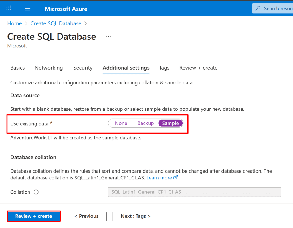 Note: In the Additional settings → Data source section, selecting Sample will create the AdventureWorksLT sample database. This option provides pre-populated tables and data for testing and demonstrations.